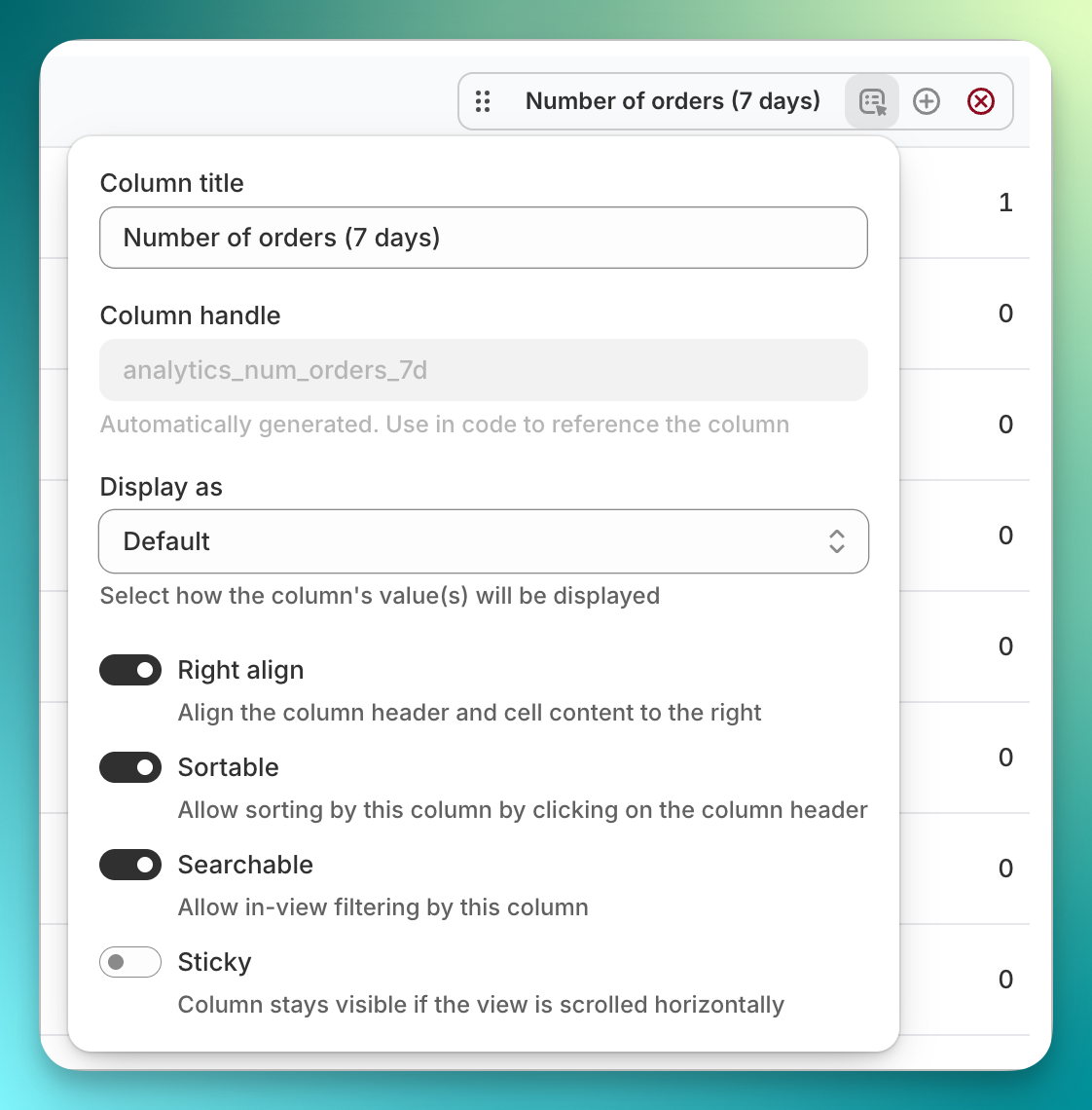 This warrants a little explanation. The columns object in the view contains an array of all the columns in the view (as defined by you). Each column has a handle property that stays the same regardless of the column's title. In this case, the Available inventory column has the handle analytics_inventory_available. You can check a column's handle via the details dialog for the column in the customizer.