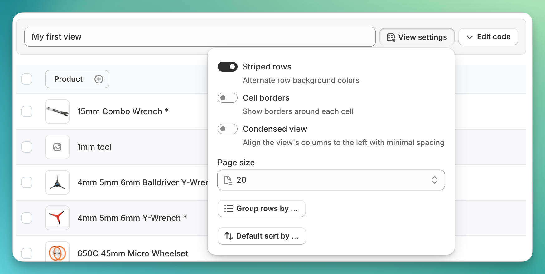 In addition to filtering rows, you can also use Liquid to conditionally format the cells in your view. For example, you can highlight a low inventory count in red, where the threshold for "low" is something you define in the code.