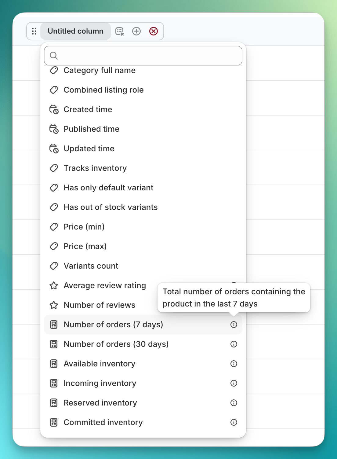 Every type of view – products, orders, and customers – has its own dedicated set of properties to select from, including both metrics from Shopify’s built-in analytics and your shop’s metafields for the view type.